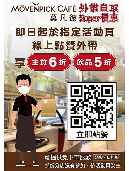 現在莫凡彼餐廳推出外帶自取餐點打6折,飲品打5折優惠